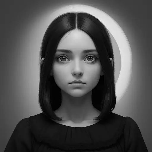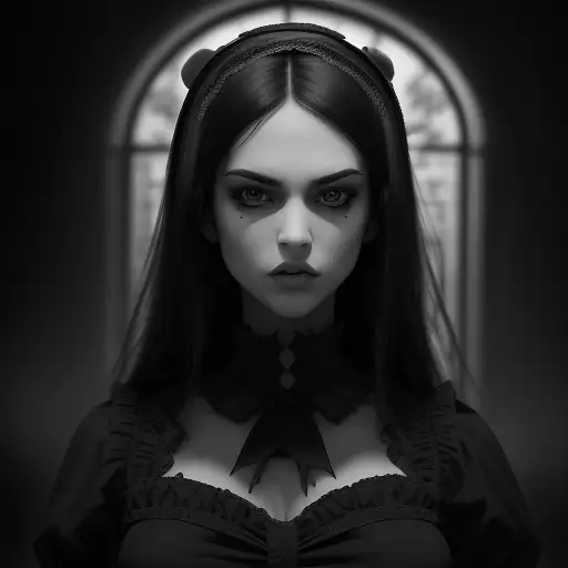 (obra maestra, premiada, calidad más alta: 1. 2), solo, obra maestra de imagen en blanco y negro, gótico con medio ojo, mirada atractiva y genial, detallado, buena iluminación, cabello negro y con cuernos, mirando de reojo, cabeza inclinada, nariz delgada, posando, buen énfasis en la mandíbula, fantasía, fondo hogareño, grandes ojos negros, simple, muy detallada, completamente nítida, 16K, UHD, HDR, cuernos negros, sin sonrisa, sensual pero perversa, con ropa provocativa y erótica, minifalda negra, retrato en un cuadro con fondo de halloween.