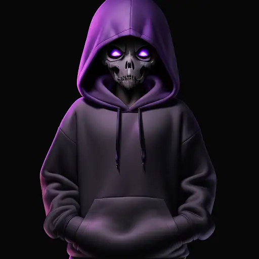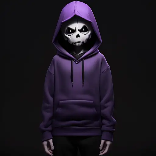 (masterpiece, award winning, highest quality:1. 2), solo, black and white image masterpiece, half-eyed goth, hot and cool look, wicked open mouth grin teeth, detailed, good lighting, black hair, looking side ways, tilted head, thin nose, posing, good emphasis of jawline, fantasy, home background, large black eyes, simple, Highly detailed, full sharp, 16K, UHD, HDR, (Masterpiece, best quality:1. 5),that the background looks like a drizzle,Little teenager in purple hooded sweater, black pants, Sans from undertale, black background, best quality, 8k, film noir.