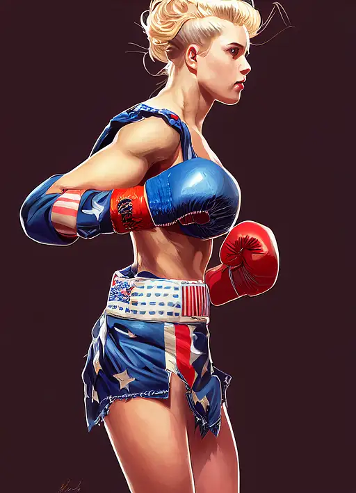 3 years ago Muscled blonde female boxer wearing stars and stripes boxing gears , intricate illustration by krenz cushart, alphonse mucha, artgerm, trending on artstation --ar 3:4 --testp --upbeta Midjourney 130 320