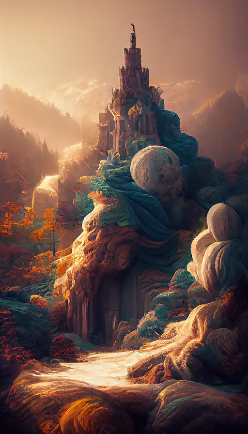 the [Wizard + Bear] of [Night's Watch, guides of the spirit world], stands at impossible suspension bridge connecting the earthly realm to "the eternal passage", "The eternal passage is a hidden valley, Kowloon Walled City Howls Moving Castle" , made in abyss, perfect lighting, rule of thirds, epic scale, escher + Alphonse Mucha and Jungi Ito::2 8k post-processing::1 sharp details, concept art, ornate fractalpunk + celestialpunk + fractalpunk rococo + art nouveau tiny villages carved into the valley Concept Art, final fantasy + DarkSouls, green and lush forest, cascading waterfalls, high rock wall, tiny rock houses, blue sky, octane render, hyper realistic, 8K::2 rendered as if paper quilling movie set carved from the flower of life, unreal engine, subsurface scattering, global illumination ::1.4 muted tones with soft lighting::2 saturated tones with soft lighting::3 --ar 9:16 --iw 3 --quality 2 --chaos 20 --stylize 2300 --stop 90 --upbeta
