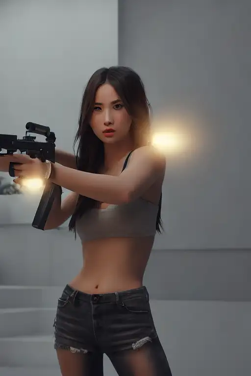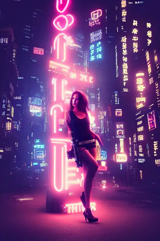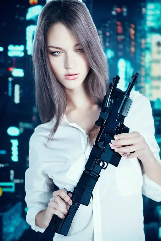white girl,beauteful girl with gun,in a white shirt, half body, Hight Quality, New York neon,cyberpunk, night, beauteful, hyperrealistic,volumetric lighting,octane render, cinematic, arnold render, 3D, super detailed, Anti-Alising, FKAA,TXAA,RTX,SSAO,port procesing, port-production, Tone Mapping, CGI, VFX, SFX, full color, HDR, Realistic, 8k --v4--q2-