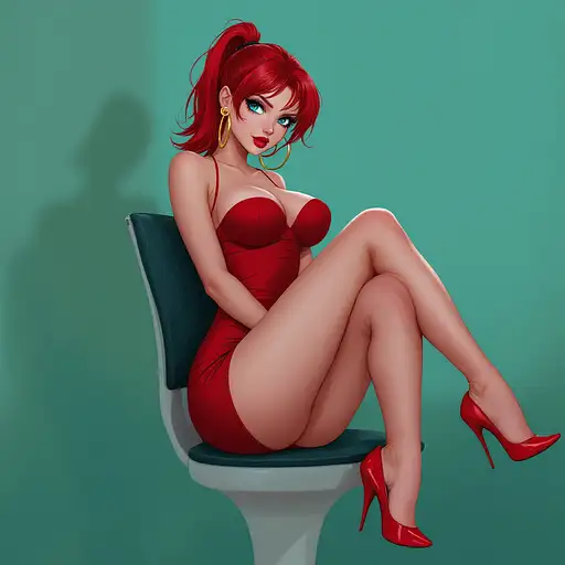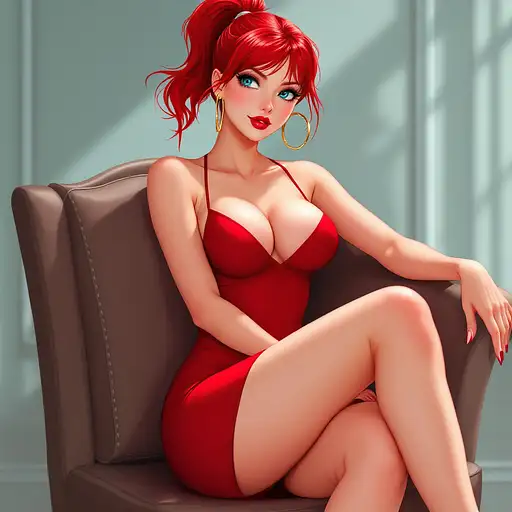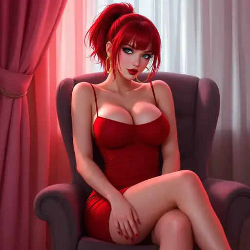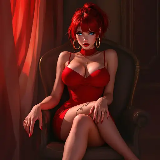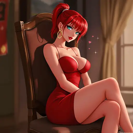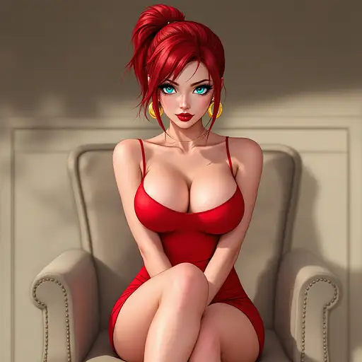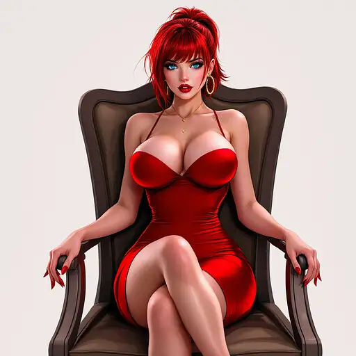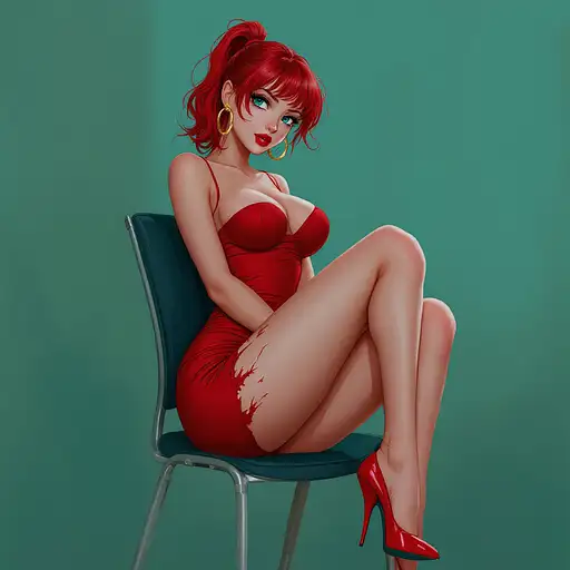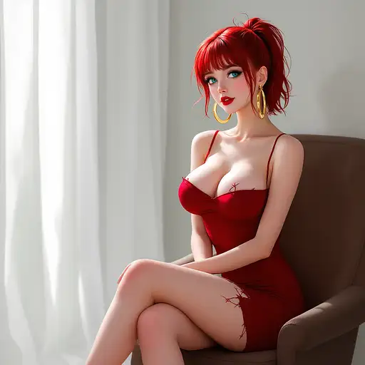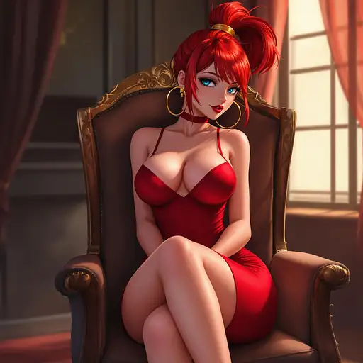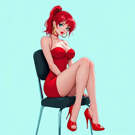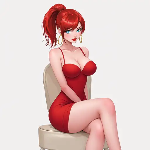 10 months ago anime, woman, red hair, short ponytail, cyan eyes, red lips, red bodycon dress, tight dress, red high heels, golden sterling hoop earrings, bare legs, closed cleavage, big chest, bare arms, with straps, sitting on a chair, legs crossed 9c3c3cf54a1 0 9