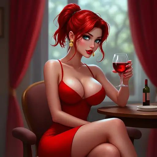 10 months ago anime, woman, red hair, short ponytail, cyan eyes, red lips, red bodycon dress, tight dress, red high heels, golden sterling hoop earrings, bare legs, closed cleavage, big chest, bare arms, with straps, sitting on a chair, legs crossed, drinking wine 9c3c3cf54a1 0 10