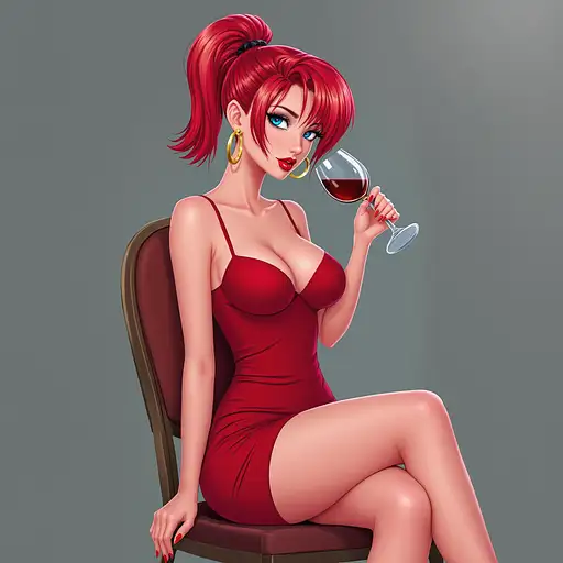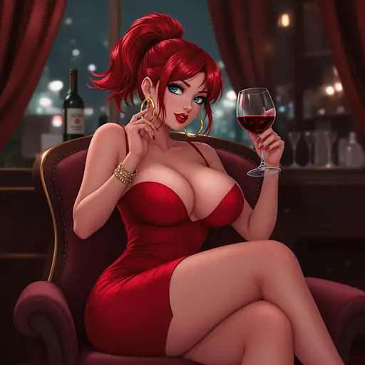 10 months ago anime, woman, red hair, short ponytail, cyan eyes, red lips, red bodycon dress, tight dress, red high heels, golden sterling hoop earrings, bare legs, closed cleavage, big chest, bare arms, with straps, sitting on a chair, legs crossed, drinking wine 9c3c3cf54a1 0 9
