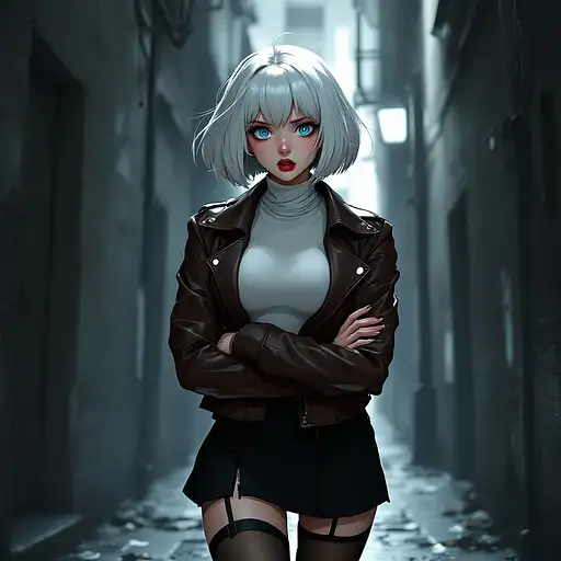 10 months ago anime, woman, white hair, bob cut, blue eyes, freckles, red lips, white turtle neck sweater, tight turtle neck sweater, short leather jacket, brown leather short jacket, black tight skirt, short skirt, black high heels, scared expression, big chest, stockings, arms crossed, eyes off camera, walking in a dark alleyway 9c3c3cf54a1 0 10