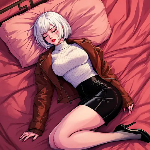 10 months ago anime, woman, white hair, bob cut, closed eyes, freckles, red lips, white sweater, tight sweater, short leather jacket, brown leather jacket, tight leather jacket, black tight skirt, short skirt, bare legs, black high heels, shy expression, big chest, lying down in bed, stockings 9c3c3cf54a1 0 16