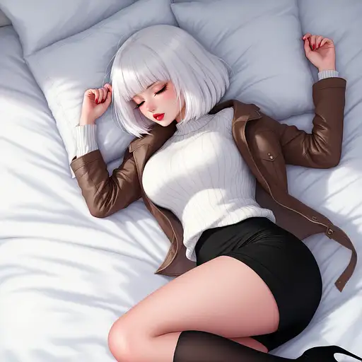 10 months ago anime, woman, white hair, bob cut, closed eyes, freckles, red lips, white sweater, tight sweater, short leather jacket, brown leather jacket, tight leather jacket, black tight skirt, short skirt, bare legs, black high heels, shy expression, big chest, lying down in bed, stockings 9c3c3cf54a1 0 20