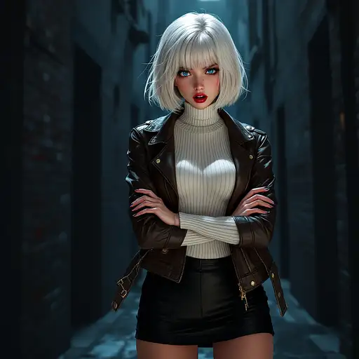 10 months ago anime, woman, white hair, bob cut, blue eyes, freckles, red lips, white turtle neck sweater, tight turtle neck sweater, short leather jacket, brown leather short jacket, black tight skirt, short skirt, black high heels, scared expression, big chest, stockings, arms crossed, eyes off camera, walking in a dark alleyway, looking away 9c3c3cf54a1 0 15