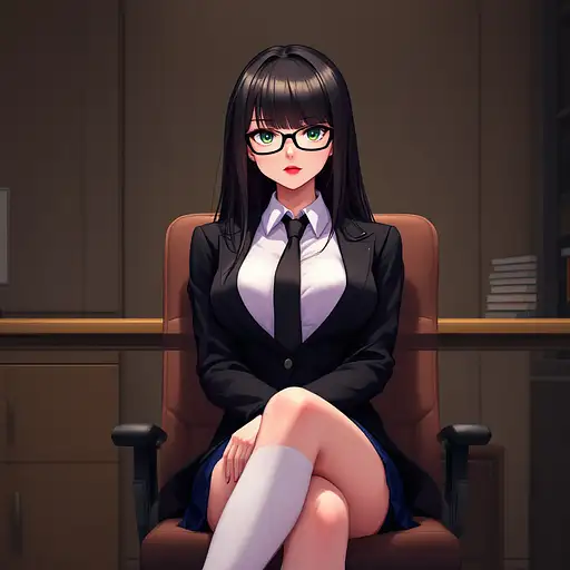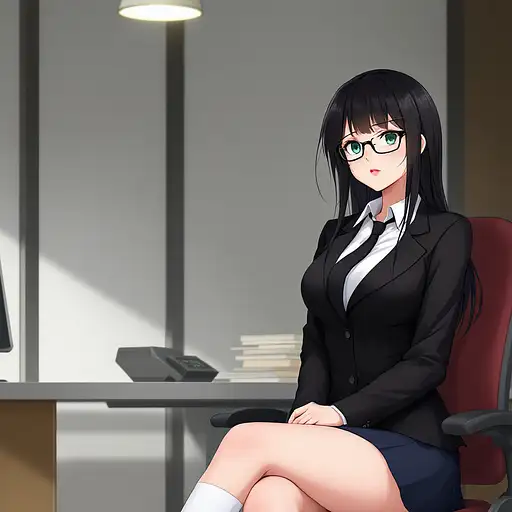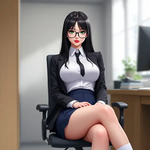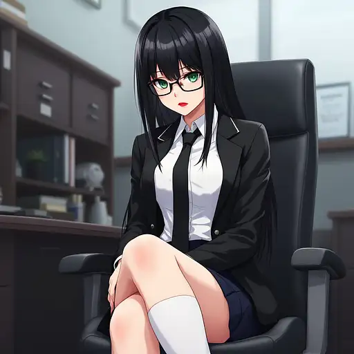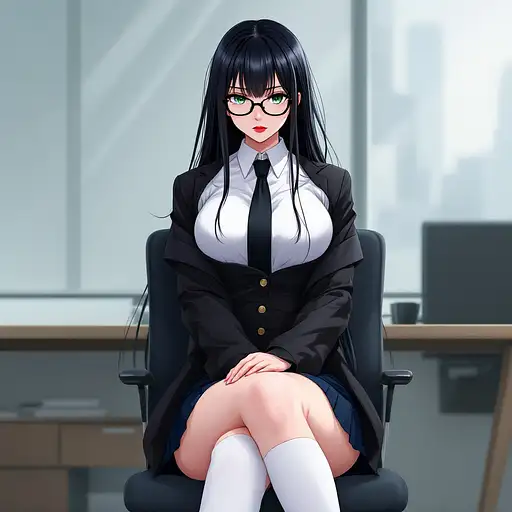 10 months ago anime, woman, black hair, long hair, green eyes, black glasses, red lips, white shirt, black tie, black blazers, short dark blue skirt, highschool skirt, white long socks, black shoes, standing at an office, bored expression, big chest, sitting on a chair, sitting with legs crossed 9c3c3cf54a1 0 19