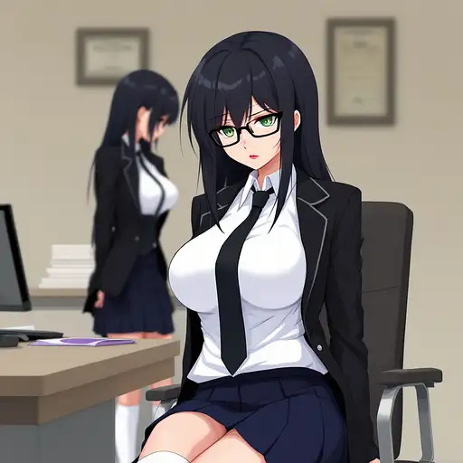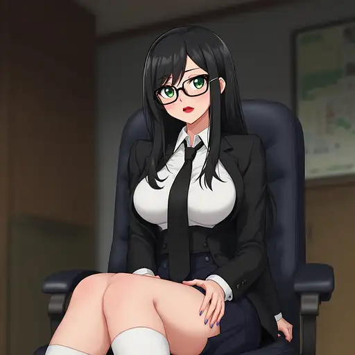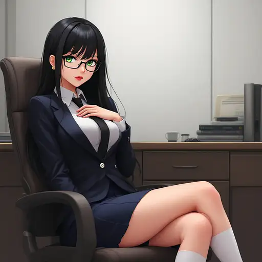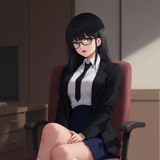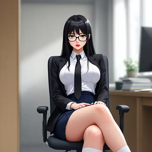 10 months ago anime, woman, black hair, long hair, green eyes, black glasses, red lips, white shirt, black tie, black blazers, tight blazers, short dark blue skirt, highschool skirt, white socks, black shoes, bored expression, big chest, sitting on a chair at an office, sitting with legs crossed, skinny belly 9c3c3cf54a1 0 22