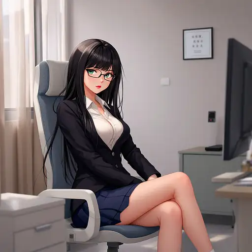 10 months ago anime, woman, black hair, long hair, green eyes, black glasses, red lips, white shirt, black tie, black blazers, short dark blue skirt, highschool skirt, white long socks, black shoes, standing at an office, bored expression, big chest, sitting on a chair, sitting with legs crossed 9c3c3cf54a1 0 9