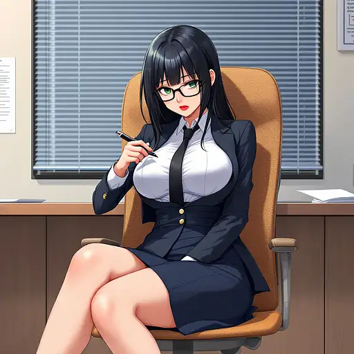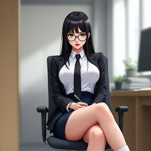 10 months ago anime, woman, black hair, long hair, green eyes, black glasses, red lips, white shirt, black tie, black blazers, tight blazers, short dark blue skirt, highschool skirt, white socks, black shoes, bored expression, big chest, sitting on a chair at an office, sitting with legs crossed, skinny belly, holding a pen 9c3c3cf54a1 0 21