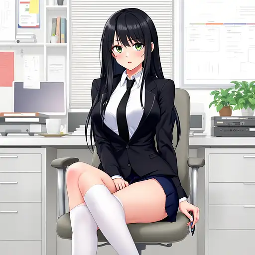 10 months ago anime, woman, black hair, long hair, green eyes, black glasses, red lips, white shirt, black tie, black blazers, tight blazers, short dark blue skirt, highschool skirt, white long socks, black shoes, standing at an office, bored expression, big chest, sitting on a chair, sitting with legs crossed, skinny belly 9c3c3cf54a1 0 19