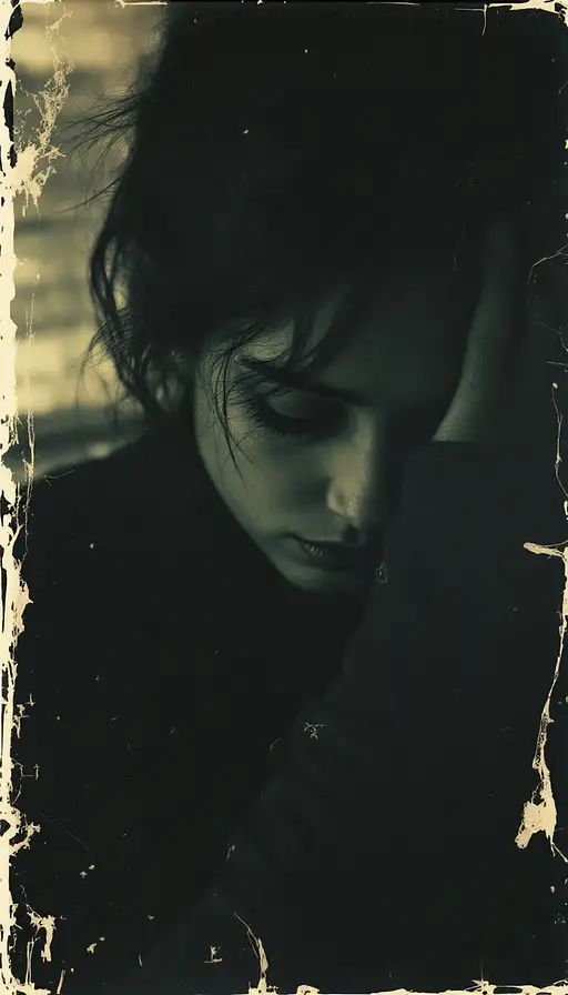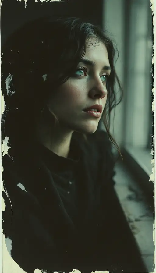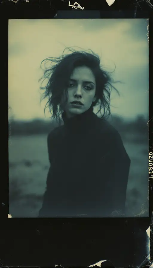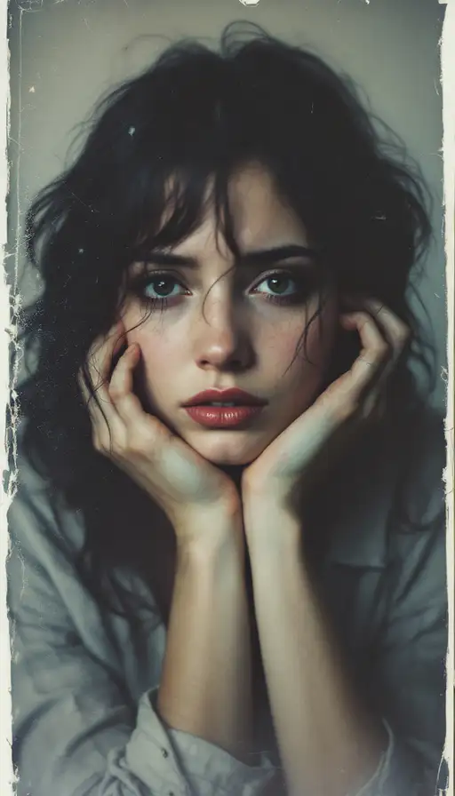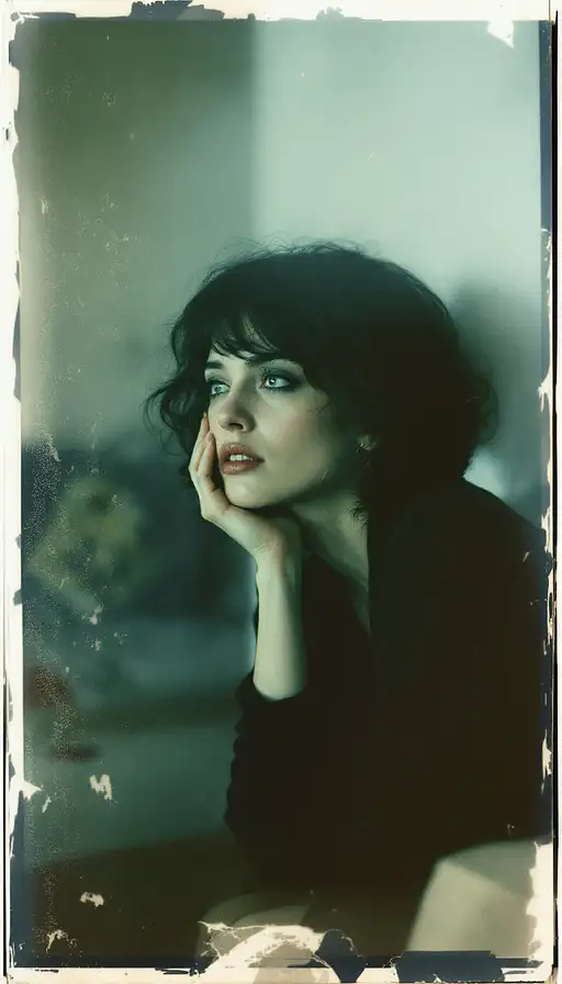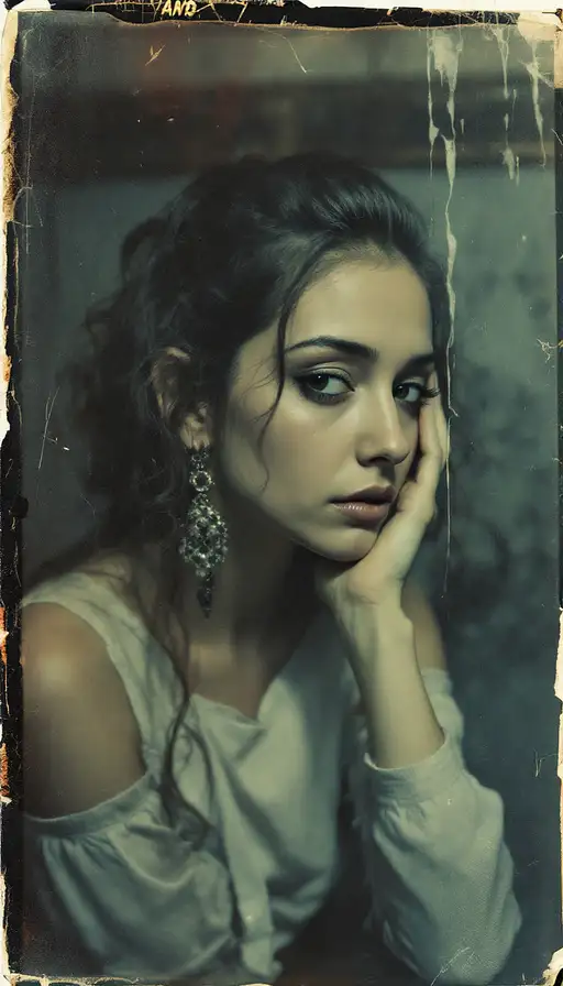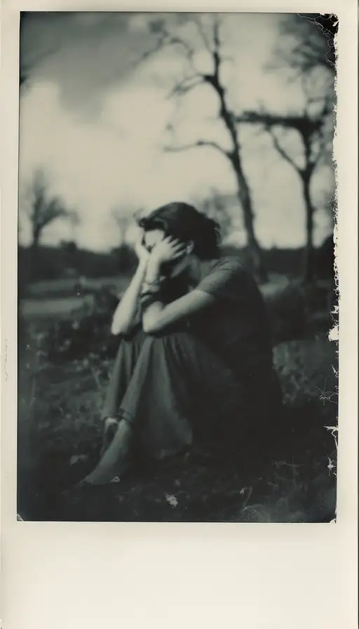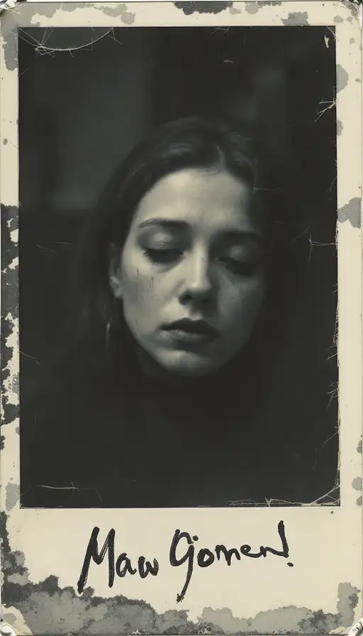 woman, old polaroid photo, sad mood