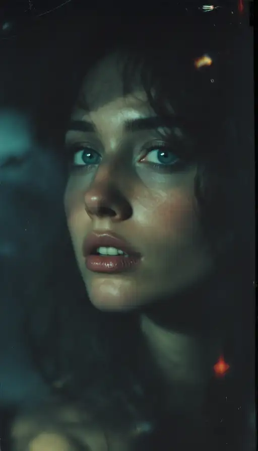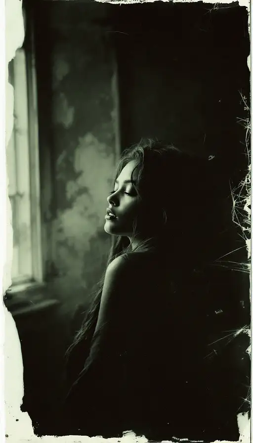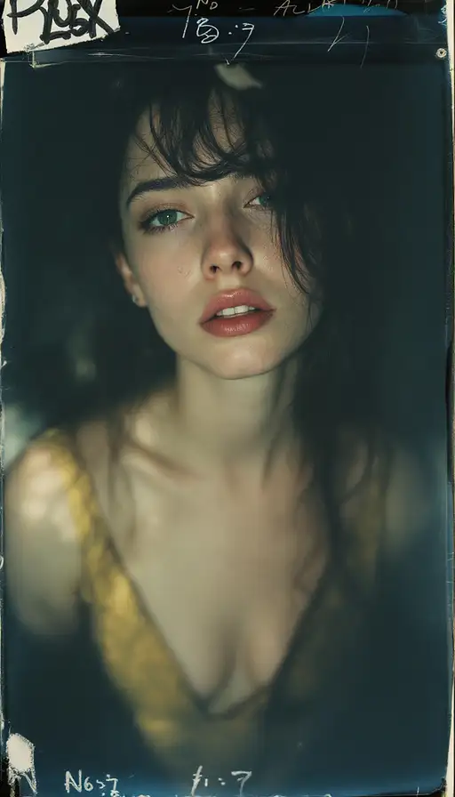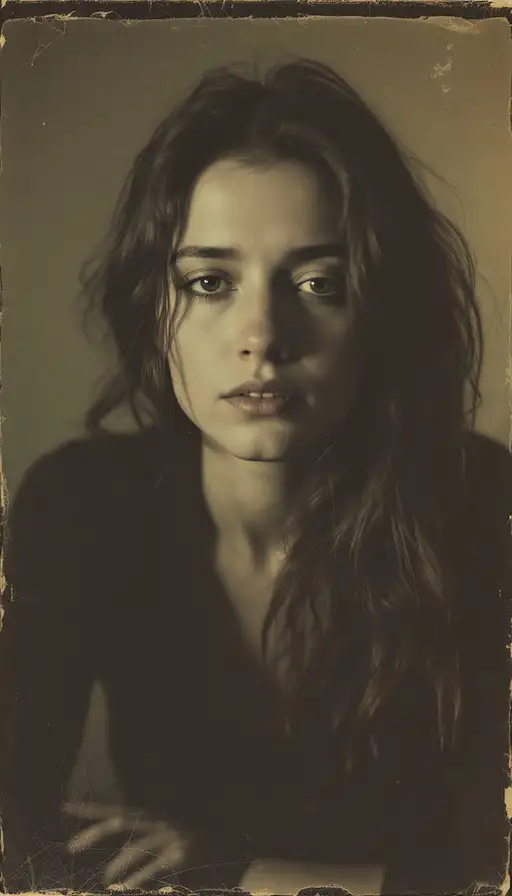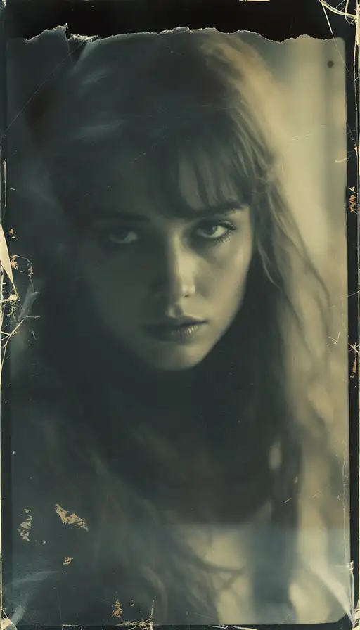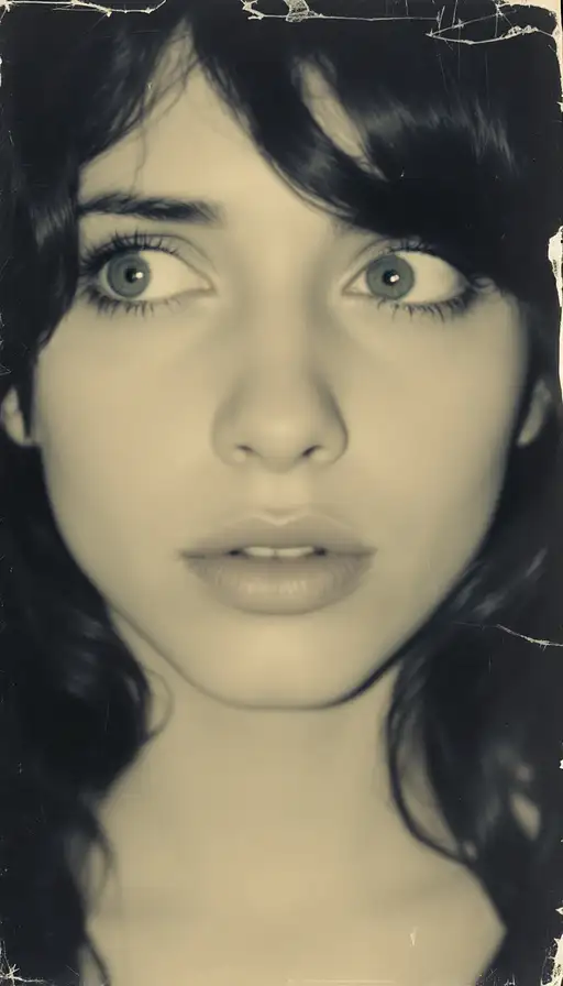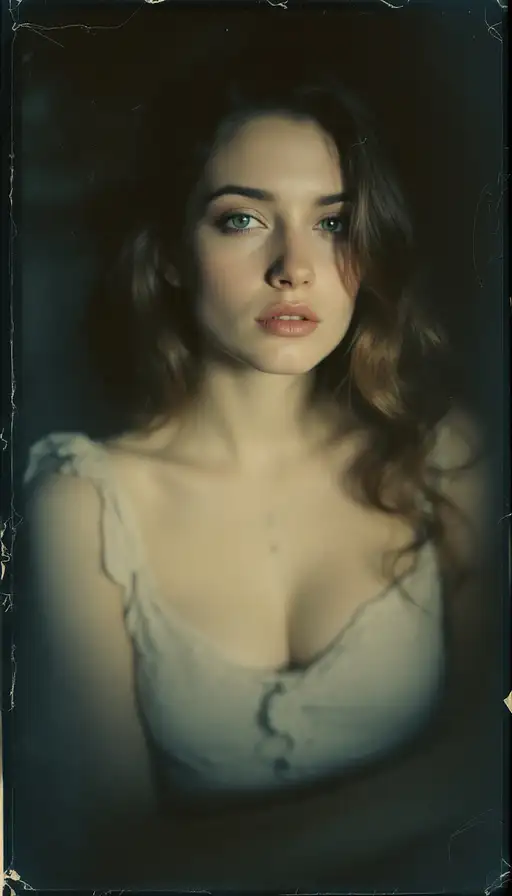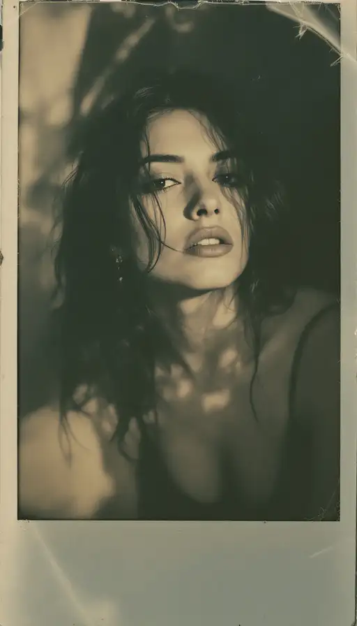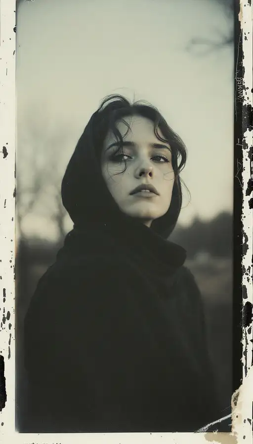woman, old polaroid photo, sad mood