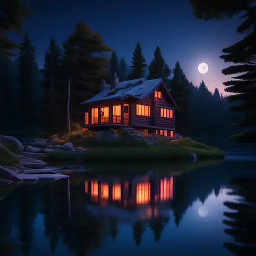 over 2 years ago A Urban cityscape with beautiful cottage on a lake , its wooden exterior bathed in neon lights casting gentle rays onto the cabin's porch,Serenely nestled,woodland retreat,rustic simplicity,highly detailed,cinematic lighting.night with lots of stars,forest,full moon,nature wide angle, 8k, colorful, hd, shooting star, muskoka cottage beautiful,uplight,Night sky, HD, Reality,extra detailed,4K AIGraphein 0 160