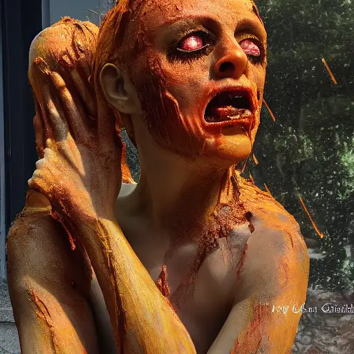 over 2 years ago a 3D realistic color photo, torn as was she screamed as orange colored flesh ripped in ritualistic horror and the crowd cheered and watched in curel enjoyment, ( a statue by by Aleksander Gierymski, featured on cgsociety, hr giger ) (( stained glass, 2 0 2 1 cinematic 8k framegrab) ( hyperrealistic photo luis royo, horror, fantasy horror, rain, temple made of flesh, wrapped in wires and piones, steel barbs, razors, octane, disfigured, deformed, mutated, ) --ar 3:2 APAWorks 0 30