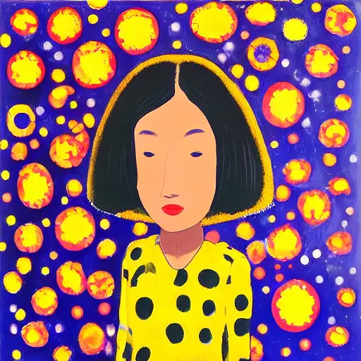 over 2 years ago a painting of a beautiful female by Yayoi Kusama, sun flowers in background, oil painting, with palette knife, --ar 3:2 --c 15 --s 5 APAWorks 0 23