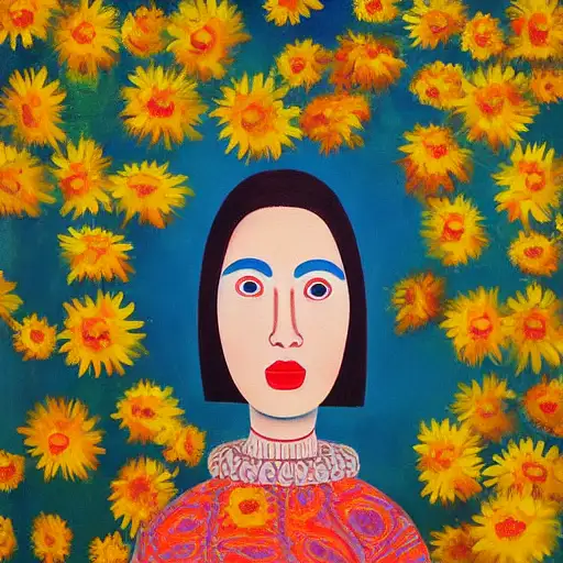 over 2 years ago a painting of a beautiful female by Yayoi Kusama, sun flowers in background, oil painting, with palette knife, --ar 3:2 --c 15 --s 5 APAWorks 0 25
