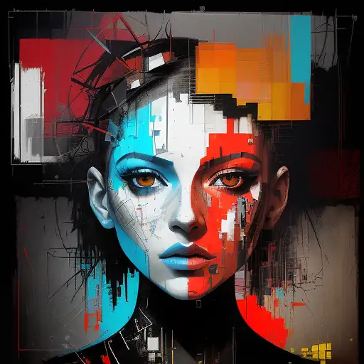 2 years ago female face, geometric abstract portrait, bright vibrant colorful, gritty, cybernetics, digital ui, abstract blocks, by Guy Denning, Russ Mills, chromatic, color blocking! , octane, object centered, oil on canvas, symmetrical, Red, concept art, abstract, trending on artstation, Pablo Picasso, Gustav Klimt, trippy, high texture, --c 100 --s 1000 --ar 3:4 --style raw --q 2 --s 750 APAWorks 2 160