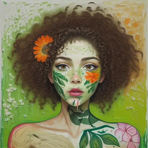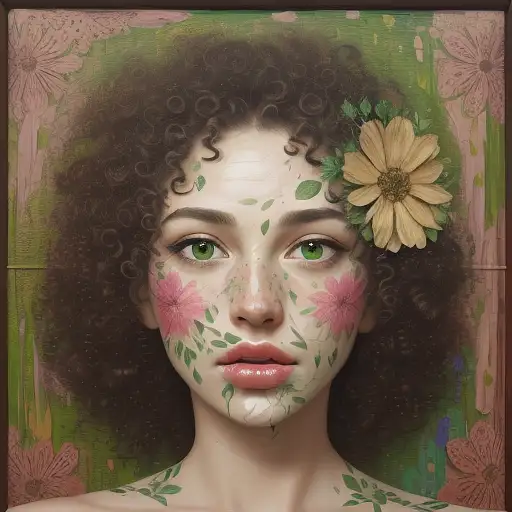 2 years ago detailed oil painting of beautiful of woman face, flower printed skin, flower patterns on face, stem patterns, thick texture, pallet knife texture, wild curly hair APAWorks 0 34