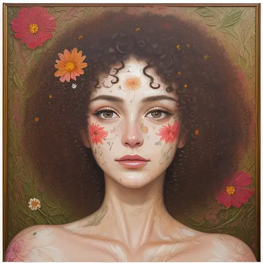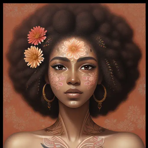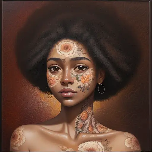 2 years ago detailed painting of beautiful of woman face, flower printed skin, flower patterns on face, think texture, afro hair APAWorks 1 62