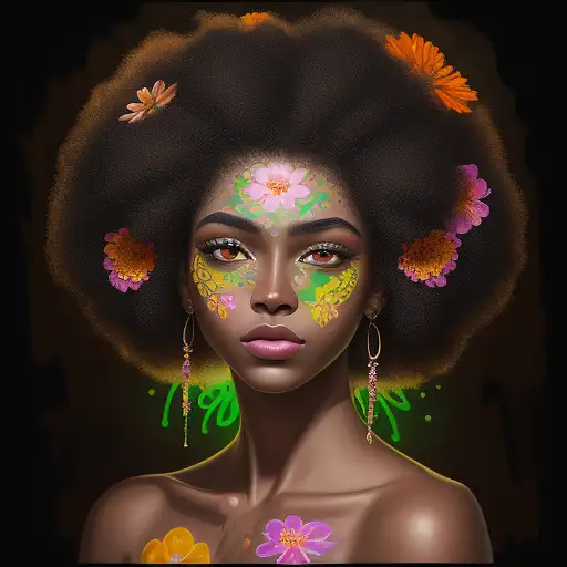 2 years ago detailed oil painting of beautiful of woman face, flower printed skin, flower patterns on face, think texture, afro hair, neon colours, dark lighting APAWorks 0 36