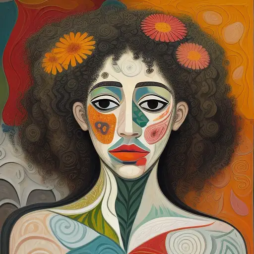 2 years ago abstract painting of woman face, flower printed skin, flower patterns on face, stem patterns, flowers coming out of mouth, thick texture, pallet knife texture, wild curly hair, cubism, Pablo Picasso style APAWorks 0 44