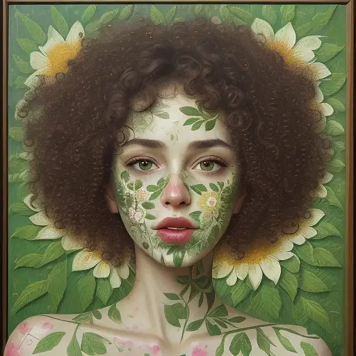 2 years ago detail of beautiful of woman face, flower printed skin, flower patterns on face, green stem patterns, flowers coming out of mouth, thick texture, pallet knife texture, wild curly hair APAWorks 0 45