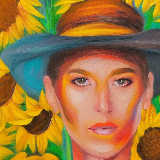 2 years ago expressionist painting, realistic face of woman, sunflower hat, texture, 4k, detail focused, extreme details, separate brush strokes APAWorks 0 150