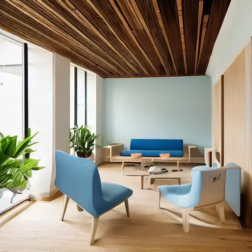 almost 3 years ago high resolution photography interior design, office room conversation pit, wooden floor, (small) windows opening onto the garden, bauhaus furniture and decoration, high ceiling, beige blue salmon pastel palette, interior design magazine, cozy atmosphere Ailukka 0 68