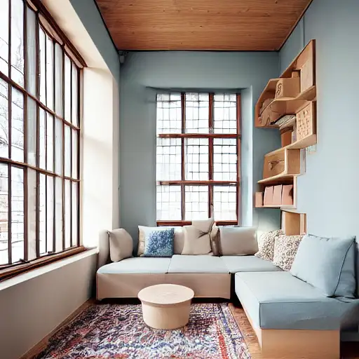 almost 3 years ago high resolution photography interior design, office room conversation pit, bookshelf, wooden floor, (small windows) opening onto the garden, bauhaus furniture and decoration, high ceiling, beige blue salmon pastel palette, interior design magazine, cozy atmosphere Ailukka 0 81