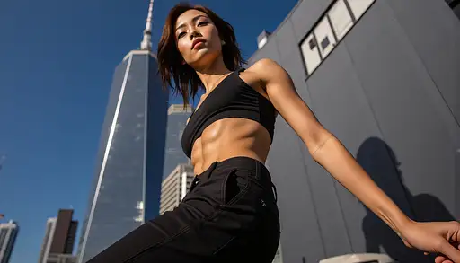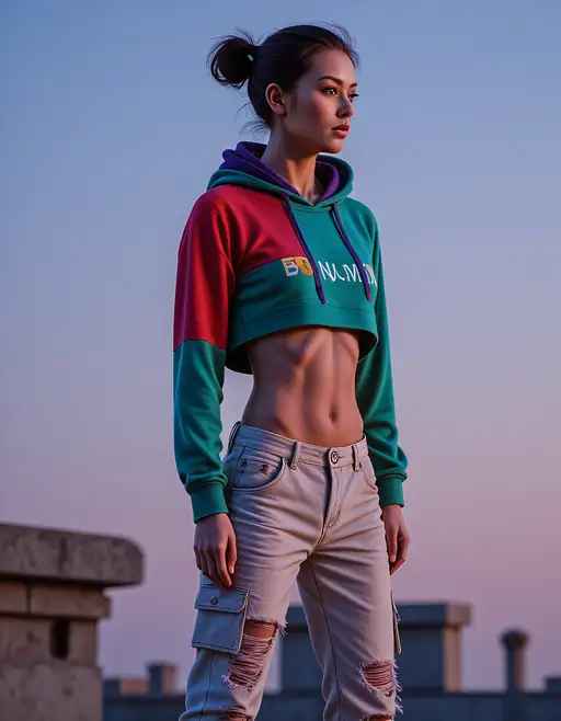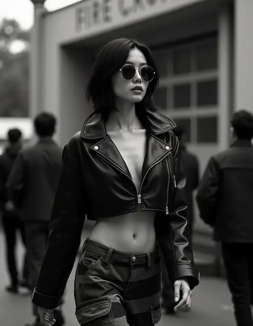 This background creates a sense of being in a liminal space between the physical and digital worlds, perfectly complementing the avant-garde outfit. The industrial elements contrast with the high-tech additions, creating a visually rich environment that enhances the futuristic and eccentric nature of the fashion piece without overshadowing it.