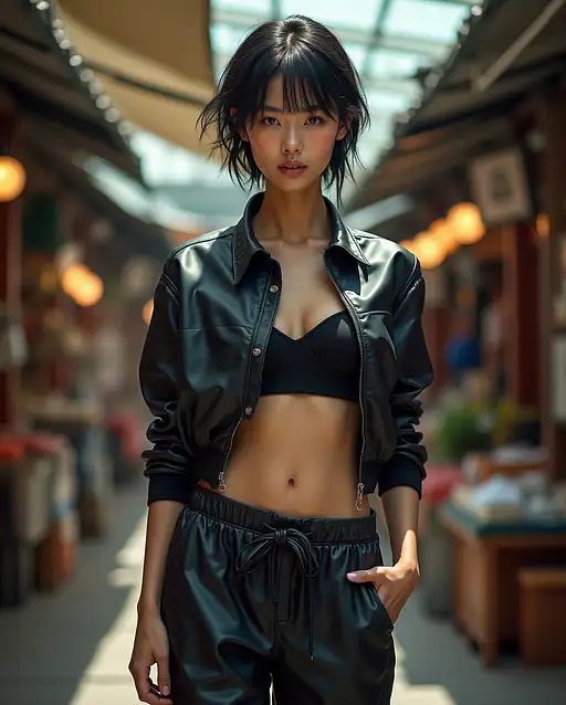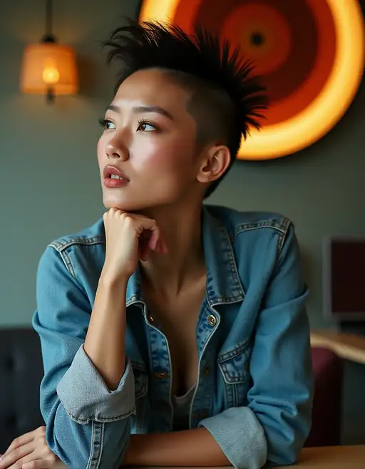 High fashion photo of a 24 year old asian female supermodel glamorous diva, Rosy skin with a natural pinkish hue, appearing healthy and flushed, natural with no make up, the skin pores and texture are clearly visible and in focus, Chiseled upper chest with firm, natural contours, small breast, flat chest, with Platinum Blonde Pixie haircut, with Sparkling, diamond Diamond eyes.