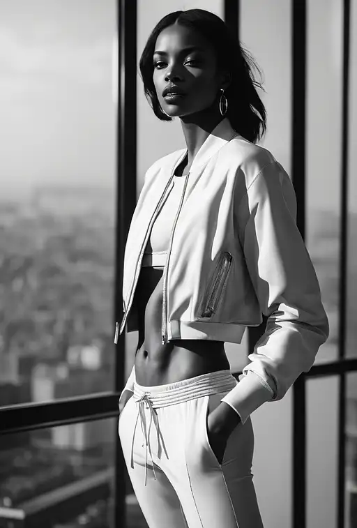 2 years ago Fashion editorial style b&w Creating artistic and expressive images with a focus on form, texture, and composition, close up on face, masterpiece photo of a young woman, Slim and slender with a slight hourglass shape, medium_tits, Stomach-revealing outfit, Crop top, joggers, bomber jacket, white sneakers., Creating an "S" shape with the body for elegance, An upscale penthouse apartment with floor-to-ceiling windows, offering panoramic city views and soft evening light., Aerial architectural view, Mamiya C330, in style of Eugene Atget . High fashion, trendy, stylish, editorial, magazine style, professional, highly detailed AkiraS 3 340