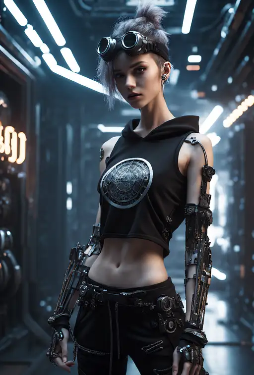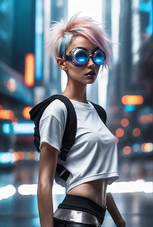 2 years ago biomechanical cyberpunk beautiful young, thin, fit, short messy hair, intrincate details, baggy pants, t-shirt, (crop hoodie), goggles, cap, midriff, bellybutton piercing, Fashion Pose, DSLR, F/2.8, Lens Flare, 5D, 16k, Super-Resolution, . cybernetics, human-machine fusion, dystopian, organic meets artificial, dark, intricate, highly detailed AkiraS 10 440