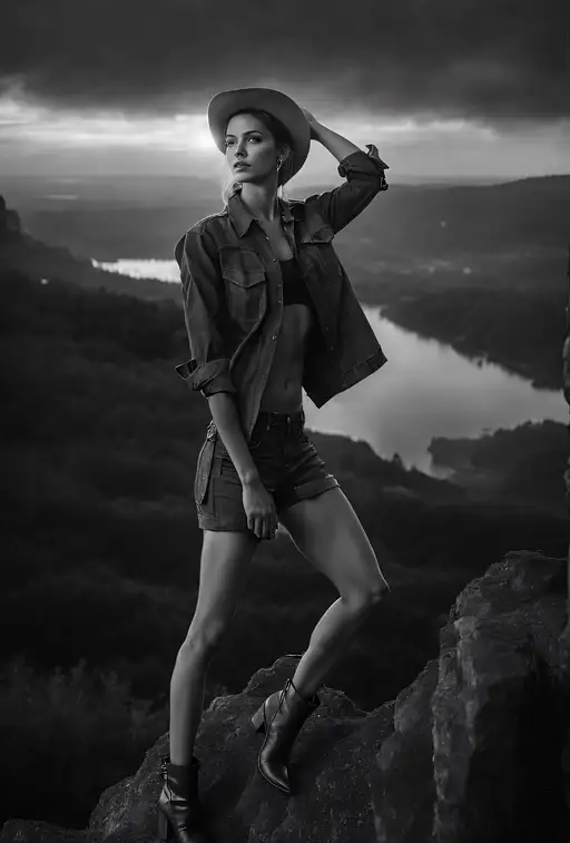 2 years ago Luxury product style b&w Emulating the emotional intensity and gravity of wartime black and white photos, shot from a distance, masterpiece photo of a young woman, Topless, Slim and wiry with a slender neck and shoulders, small_tits, Western-style shirt, denim shorts, cowboy boots., Stretching arms overhead to elongate the body, A dramatic cliffside overlook at twilight, capturing the mysterious and moody light., Ground level architectural view, Canon AE-1, in style of Alex Timmermans . Elegant, sophisticated, high-end, luxurious, professional, highly detailed AkiraS 2 190