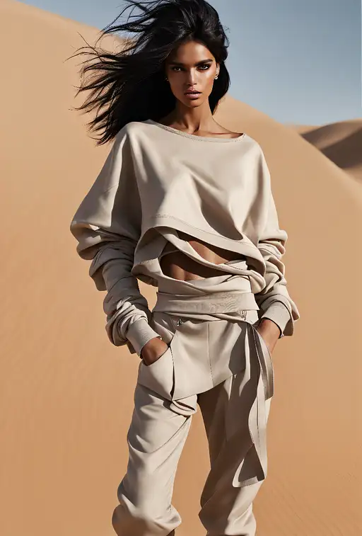 2 years ago Fashion editorial style 1 girl, Abdominal peek-a-boo design, Slender and curvy with a well-proportioned figure, Posing with one hand on hip and the other at the side , black Silver hair , messy hair, long hair blowing in the wind, thin, small breasts, Leggings, oversized sweatshirt, chunky sneakers., Desert sand dunes . High fashion, trendy, stylish, editorial, magazine style, professional, highly detailed AkiraS 6 430