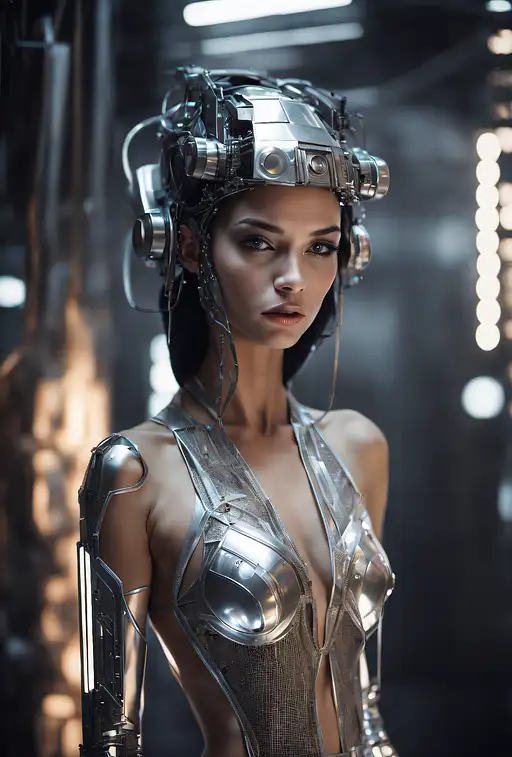 2 years ago biomechanical cyberpunk event photography, high angle, masterpiece photo of a young woman, Thin and fragile with long, lean limbs, flat breast, Belly-baring outfit, Metallic robe dress, platform sandals, circuit halo headpiece, Taking confident strides on a futuristic catwalk, showcasing your cyberpunk ensemble, Abandoned Power Plant with Industrial Architecture and Neon Highlights., Split level angle, Rollei 35, in style of Hans Bellmer . cybernetics, human-machine fusion, dystopian, organic meets artificial, dark, intricate, highly detailed AkiraS 7 290