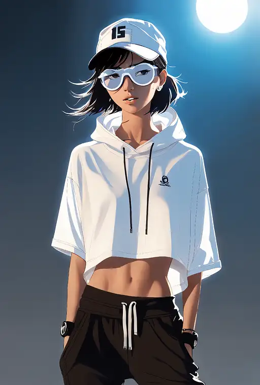 2 years ago silhouette style beautiful young, thin, fit, short messy hair, intrincate details, baggy pants, t-shirt, (crop hoodie), goggles, cap, midriff, bellybutton piercing, Fashion Pose, DSLR, F/2.8, Lens Flare, 5D, 16k, Super-Resolution, . high contrast, minimalistic, black and white, stark, dramatic AkiraS 2 150