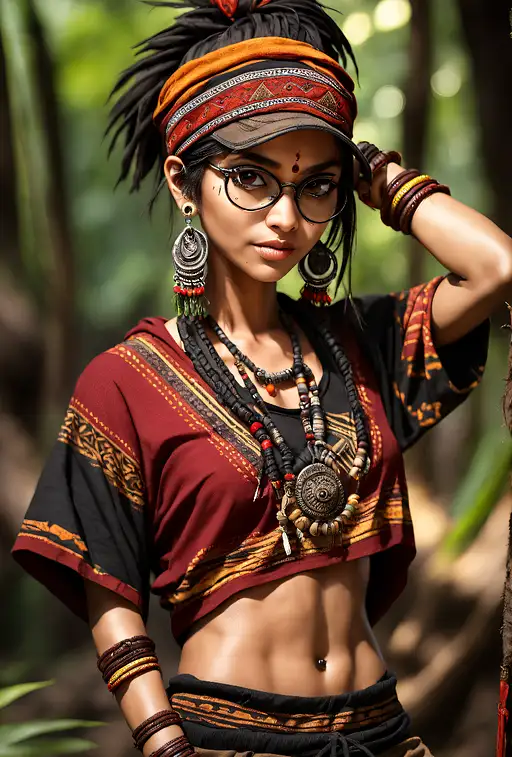 2 years ago tribal style beautiful young, thin, fit, short messy hair, intrincate details, baggy pants, t-shirt, (crop hoodie), goggles, cap, midriff, bellybutton piercing, Fashion Pose, DSLR, F/2.8, Lens Flare, 5D, 16k, Super-Resolution, . indigenous, ethnic, traditional patterns, bold, natural colors, highly detailed AkiraS 4 300