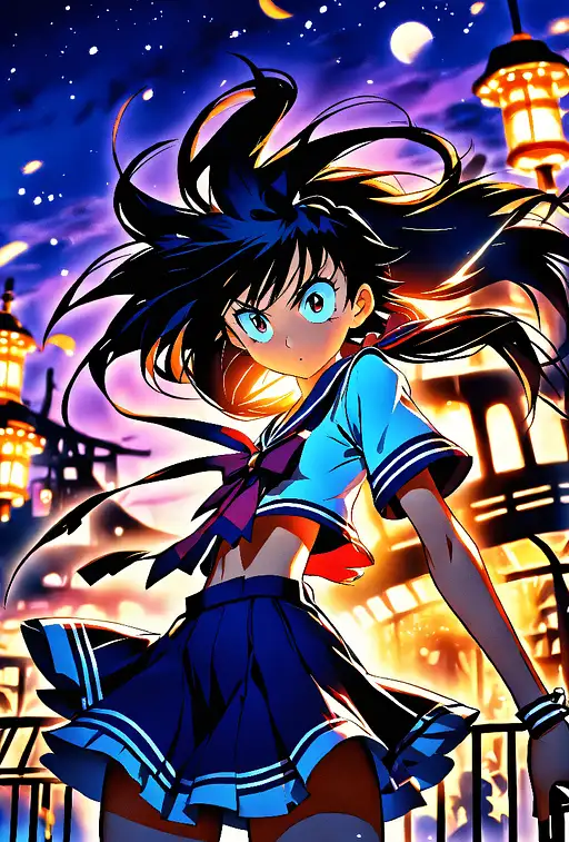 2 years ago anime artwork 1 girl, Stomach-revealing outfit, Lean and slender with a straight, slender figure, Over-the-Shoulder Look , black Black hair , messy hair, long hair blowing in the wind, thin, small breasts, Sailor Fuku (Sailor Uniform), Haunted, Abandoned Amusement Park at Night, Candlelight . anime style, key visual, vibrant, studio anime, highly detailed AkiraS 1 200