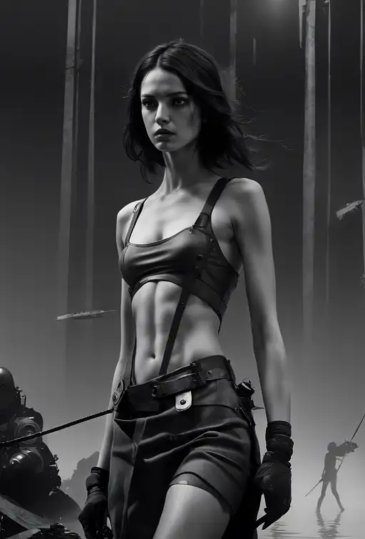 2 years ago dystopian style high fashion photography masterpiece photo of a supermodel, Slim with a slight pear shape and toned muscles,flat breast,Waist-revealing attire, Tattered, patched-up clothing, Taking part in dangerous and deadly challenges, full body, A sputtering and feeble light of an underground rebellion's headquarters illuminated the defiant faces of those who fought against an oppressive regime., Symmetrical angle, Zeiss Contarex, in style of Yousuf Karsh, . bleak, post-apocalyptic, somber, dramatic, highly detailed AkiraS 4 250