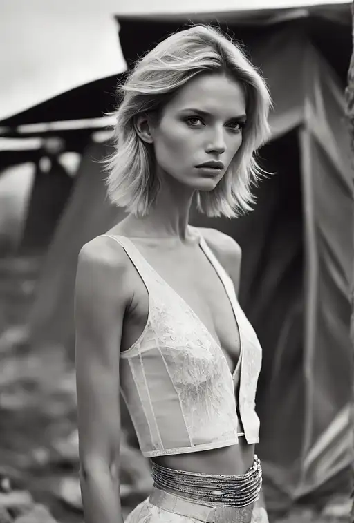 2 years ago Fashion editorial style instant photo masterpiece photo of a supermodel, Slender and petite with a delicate bone structure,medium_tits,Crop top, Outfits with built-in speakers to amplify authoritarian messages, Marching in synchronized, robotic formations, head shot, A dim and intermittent light of a makeshift shelter exposed the vulnerability and fragility of those seeking refuge from the ravages of a war-torn world., Frontal angle, Hasselblad X1D II, in style of Ando Fuchs, . High fashion, trendy, stylish, editorial, magazine style, professional, highly detailed AkiraS 8 670