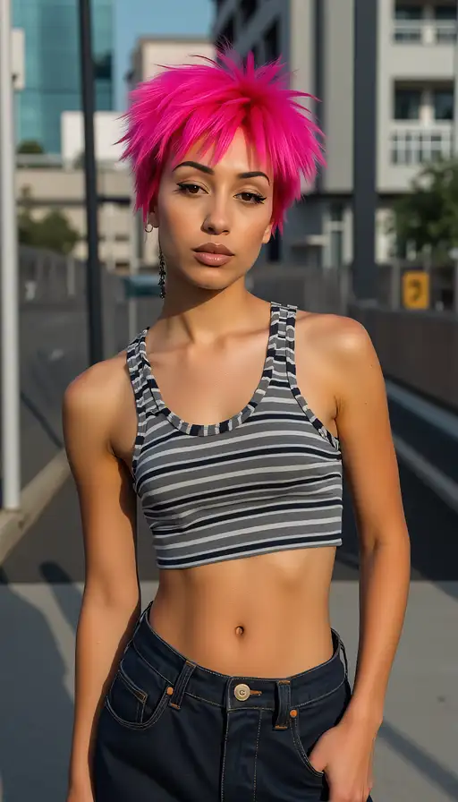 full body Masking, Custom Brush Creation drawing of a 24-year-old Guatemalan female fierce martial artist with a warm and inviting expression. She has Soft, ivory skin that shows a slight pinkish hue, especially in cold weather. The skin pores and texture are clearly visible and in focus. Her Long, horizontal oval eyes, Twinkling, topaz eyes, framed by long, elegant eyelashes. Her haircut is Umbrian Upswept - Short back with longer crown layers. Her eyebrows are neatly shaped, complementing her delicate facial features. Her body is Sleek, toned upper chest with smooth, defined lines, small breast, toned abs, Female Bodybuilding style. She wears a cropped Fur-trimmed cropped cardigan, midriff, a lowrise High-waisted pencil skirt with contrast stitching. She poses Standing with one arm extended as if reaching for something. She is positioned on the left side in the frame by the rule of thirds. In the background Foggy medieval street with gas lamps and cobblestone paths. The scene is lighted Muted overcast light with a dreamy softness. the model is lighted with soft natural lighting in the style of Milo Manara