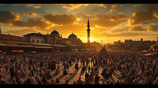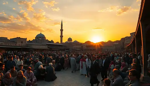a painting of a bustling medieval marketplace in a Middle Eastern city. The two women in the foreground are wearing red headscarves and robes, with the woman on the left having a yellow dress underneath. The woman on the right is wearing a red robe. Off in the distance surrounded by onlookers a fantasy scene of a beautiful 25 year old lithe female belly dancer with long dark locks, her arms crossed at the wrists, in a richly detailed medieval-style interior. The belly dancer is wearing flowing, delicate belly dancing red silk garments with intricate gold and silver accents, symbolizing their role and beauty. The room is warmly lit with the glow of torches and candles, featuring ornate tapestries, a throne-like chair in the background, and luxurious cushions. The atmosphere is one of elegance and loyalty, with the individual exuding serenity and grace. The style should be highly detailed, with soft, realistic textures and warm tones. The background is a wide-angle view of the city, with a large castle on a hill in the distance. The sky is blue with white clouds, and birds are flying overhead. The painting is done in a realistic style, with attention to detail in the architecture, clothing, and textures. The overall effect is one of vibrant color and energy, capturing the sights and sounds of a bustling marketplace.