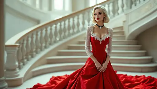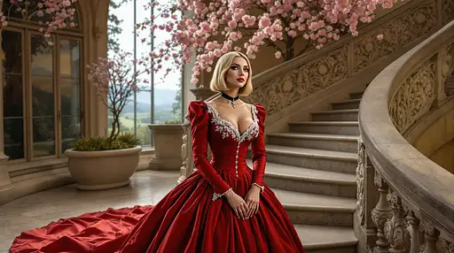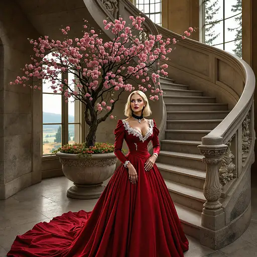 a woman standing in the center of a grand, ornate ballroom, surrounded by a crowd of people. Her platinum blonde hair is styled in a braided crown, adding to her regal demeanor. She wears a stunning dark green gown with gold embroidery and red accents, complete with a matching choker necklace. The gown features a sweetheart neckline and a full skirt that falls to the floor in soft folds. The gold embroidery on the gown is intricate and detailed, featuring a pattern of flowers and leaves that adds to the overall sense of luxury and refinement. The woman's makeup is subtle yet striking, with a focus on enhancing her natural features. Her eyes are a deep brown, fringed with thick lashes that add to their allure. Her lips are a soft pink, curved into a slight smile that suggests a sense of confidence and poise. The woman's pose is confident and poised, with her hands by her sides and a slight smile playing on her lips. She stands with her weight evenly distributed on both feet, her shoulders back and her head held high. The overall effect is one of elegance and refinement, as if she is a queen surveying her kingdom. The background of the image is a wide-angle view of the ballroom, with several people milling about in the distance. The room is grand and ornate, with high ceilings and crystal chandeliers that refract the light and add to the overall sense of luxury. The walls are adorned with intricate moldings and ornate frescoes, adding to the sense of history and tradition. To the left of the woman, a group of people are gathered around a string quartet, listening intently as they play. The musicians are seated on ornate chairs, with their instruments at the ready. The music stands in front of them are adorned with intricate carvings, adding to the overall sense of luxury and refinement. To the right of the woman, a large stone fireplace dominates the wall, with a roaring fire crackling and spitting in the grate. The fireplace is adorned with intricate carvings, featuring a pattern of flowers and leaves that adds to the overall sense of luxury and refinement. The lighting in the image is warm and inviting, with soft golden tones that add to the overall sense of luxury and refinement. The camera perspective is wide-angle, capturing the full sweep of the ballroom and the people in it. The style of the image is reminiscent of a Renaissance painting, with its use of rich colors and classical composition. The camera used to capture this image is likely a high-end digital SLR, with a wide-angle lens that allows for a broad field of view.