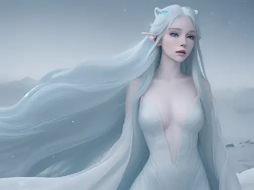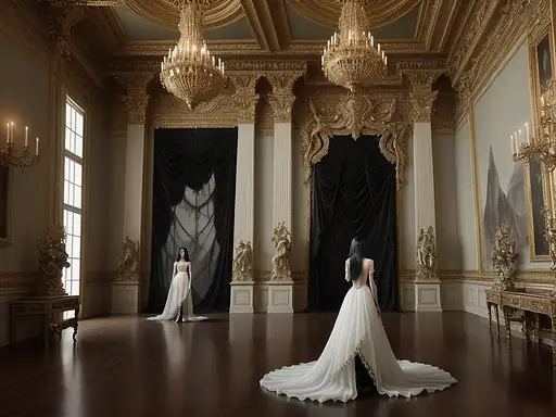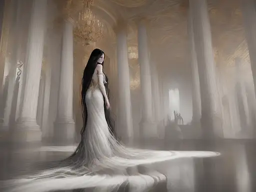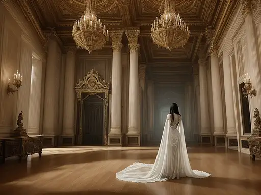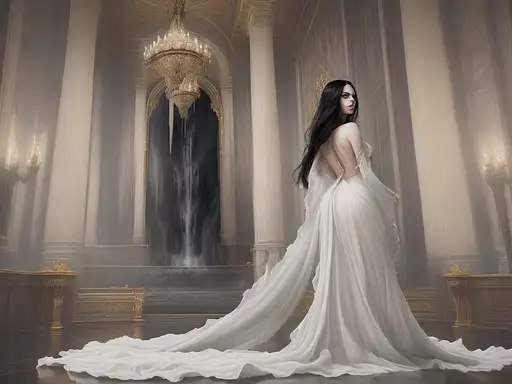 a breathtaking portrait of a woman with an ethereal aura, set against the backdrop of a grand, ornate room that seems to transport the viewer to a realm of fantasy and wonder. The woman stands serenely, her long, dark hair cascading down her back like a waterfall of night. Her attire is a masterful blend of elegance and sophistication, featuring a stunning white dress adorned with intricate gold accents that seem to shimmer and shine in the light. The dress is further embellished with sparkling blue gems that add a touch of luxury and glamour to her overall appearance. A delicate gold necklace graces her neck, complemented by an elegant gold bracelet that adds a touch of refinement to her ensemble. Her dress features a high slit on one side, showcasing her toned leg and adding a touch of drama and flair to her overall pose. But the true showstopper is the pair of large, transparent, feathered wings that protrude from her back, giving her an undeniably angelic aura. The wings seem to glow with a soft, ethereal light, as if infused with an otherworldly energy. The background of the image is a grand, ornate room that seems to have been plucked straight from the pages of a fairy tale. Tall, golden pillars stretch up towards the ceiling, supporting a vaulted roof that seems to disappear into the heavens. A large, stained-glass window dominates one wall, casting a kaleidoscope of colors across the floor. To the left of the woman, a delicate, golden chandelier hangs from the ceiling, casting a warm, golden glow over the entire scene. The walls are adorned with intricate, golden filigree, adding a touch of opulence and luxury to the overall atmosphere. The overall effect is one of breathtaking wonder and enchantment, as if the viewer has stumbled into a magical realm hidden from the mundane world.