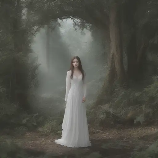 10 months ago a young beautiful alluringly seductive woman in a long, flowing dress standing in a forest, facing a large dragon. The woman has long, wavy brown hair and is wearing a long, flowing white dress with a high neckline and long sleeves. The dress is made of a lightweight material that drapes elegantly around her body. The woman is standing in a forest, surrounded by tall trees and dense foliage. The lighting in the image is soft and ethereal, with a warm glow that suggests a sunny day. The camera perspective is from a low angle, looking up at the woman and the dragon. This creates a sense of grandeur and power, emphasizing the size and majesty of the dragon. The style of the image is fantasy, with a focus on creating a sense of wonder and enchantment. The use of soft lighting and muted colors adds to the dreamy, ethereal quality of the image. Alpha32256 0 18