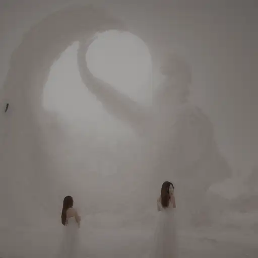 10 months ago The image depicts a woman in a white dress standing in front of a large dragon, with a full moon in the background. The woman has long brown hair and is wearing a long, flowing white dress that appears to be made of a lightweight material. The dragon is massive, with its head and neck filling the right side of the image. It has glowing red eyes and sharp teeth. The background of the image is a dark, cloudy sky with a full moon shining brightly through the clouds. The overall style of the image is fantasy, with a focus on the dramatic and mystical elements of the scene. Alpha32256 0 31